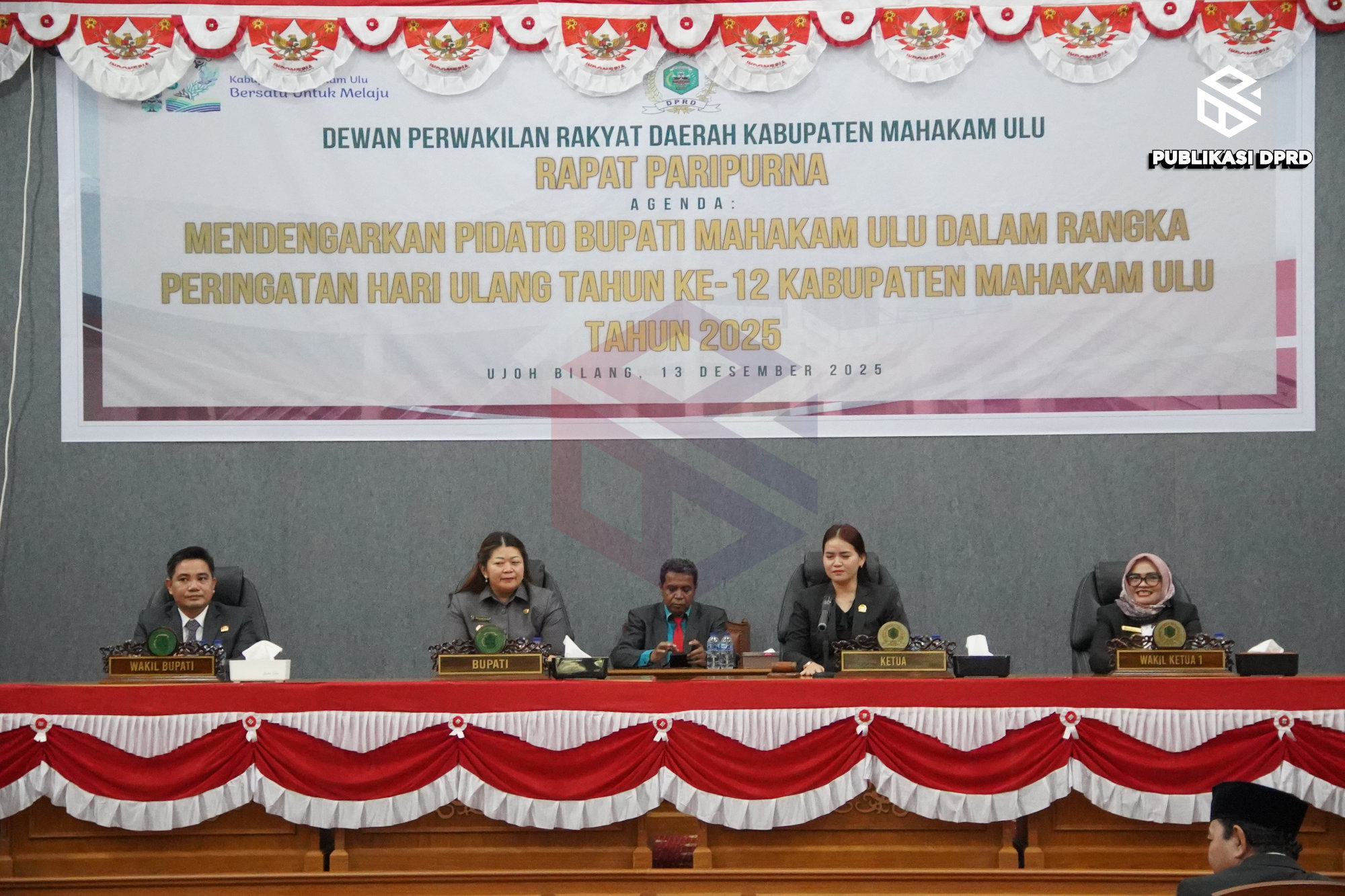 UJOH BILANG – Dewan Perwakilan Rakyat Daerah (DPRD) Kabupaten Mahakam Ulu (Mahulu) menggelar Rapat Paripurna dengan agenda mendengarkan pidato Bupati Mahakam Ulu dalam rangka Peringatan Hari Ulang Tahun (HUT) ke-12 Kabupaten Mahakam Ulu Tahun 2025. Kegiatan tersebut berlangsung dalam suasana hangat dan penuh kekeluargaan di Gedung DPRD Mahakam Ulu, Sabtu (13/12/2025).