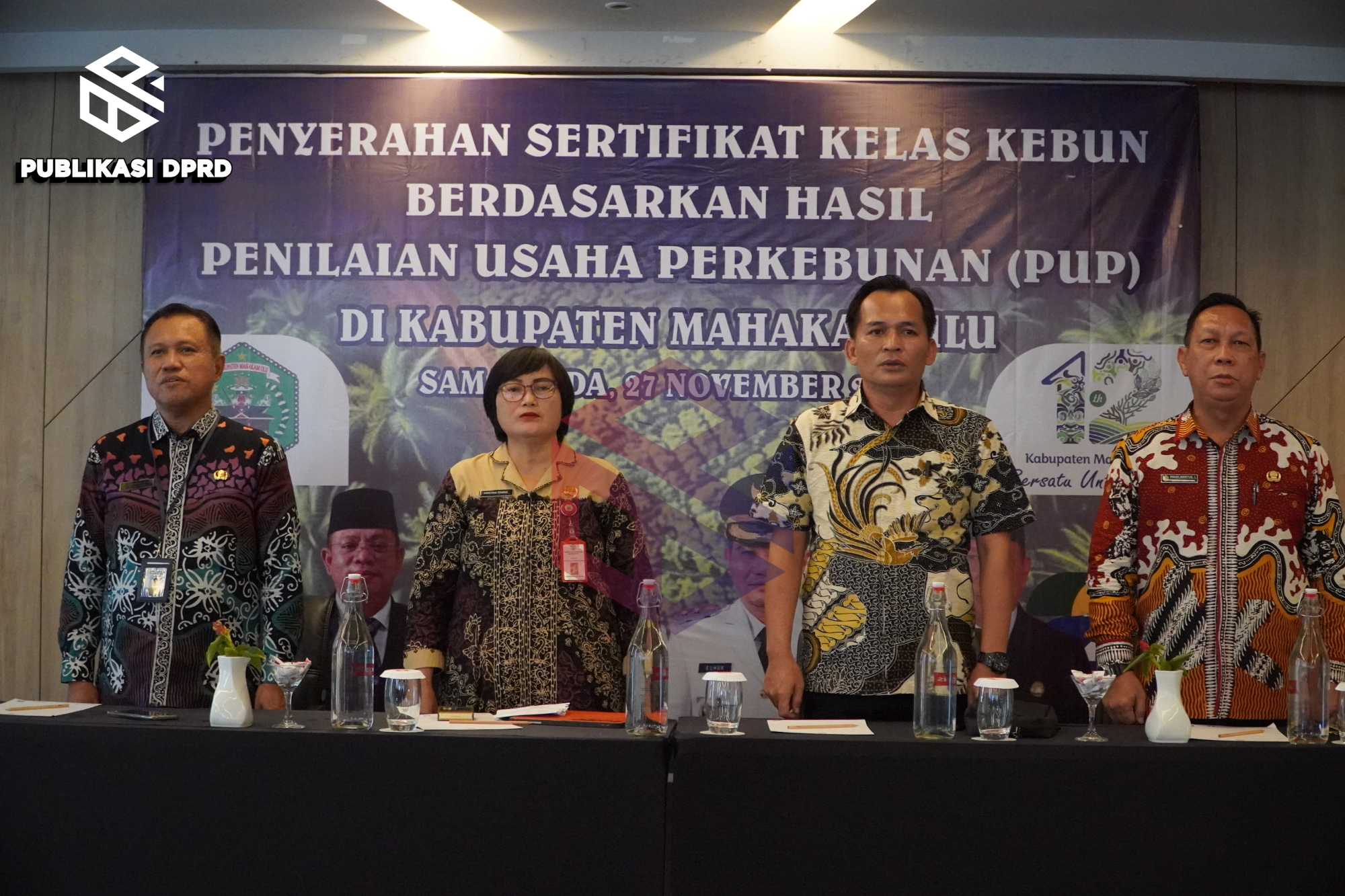 SAMARINDA – Dewan Perwakilan Rakyat Daerah (DPRD) Kabupaten Mahakam Ulu (Mahulu) menghadiri kegiatan Penyerahan Sertifikat Kelas Kebun berdasarkan hasil Penilaian Usaha Perkebunan (PUP) di Kabupaten Mahulu, yang berlangsung di Ruang Classical, Lantai 3 Hotel Ibis Samarinda, pada Kamis (27/11/25).